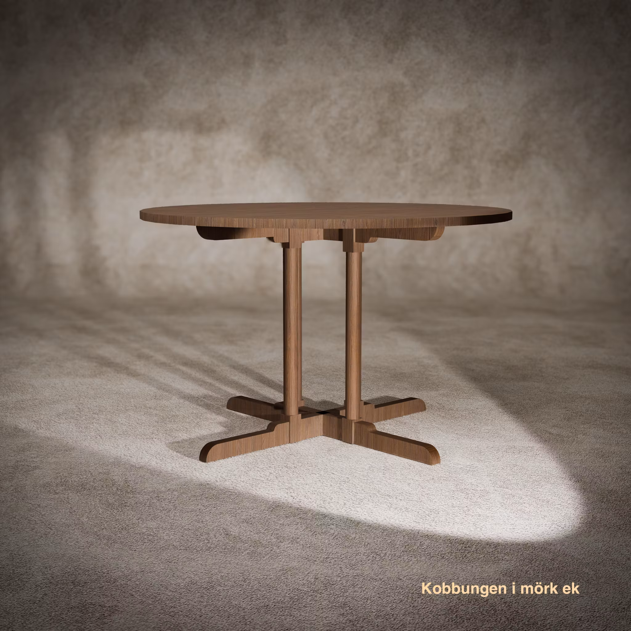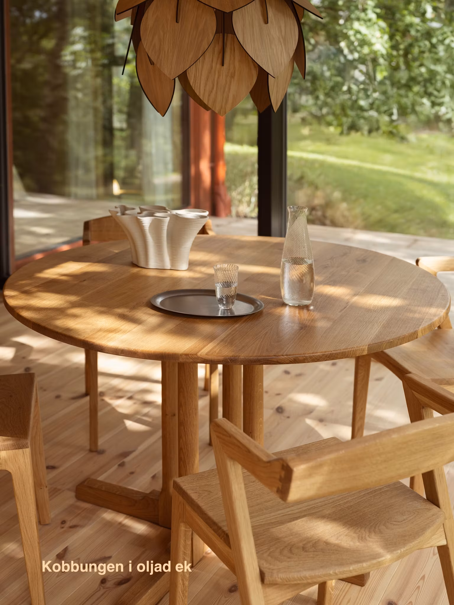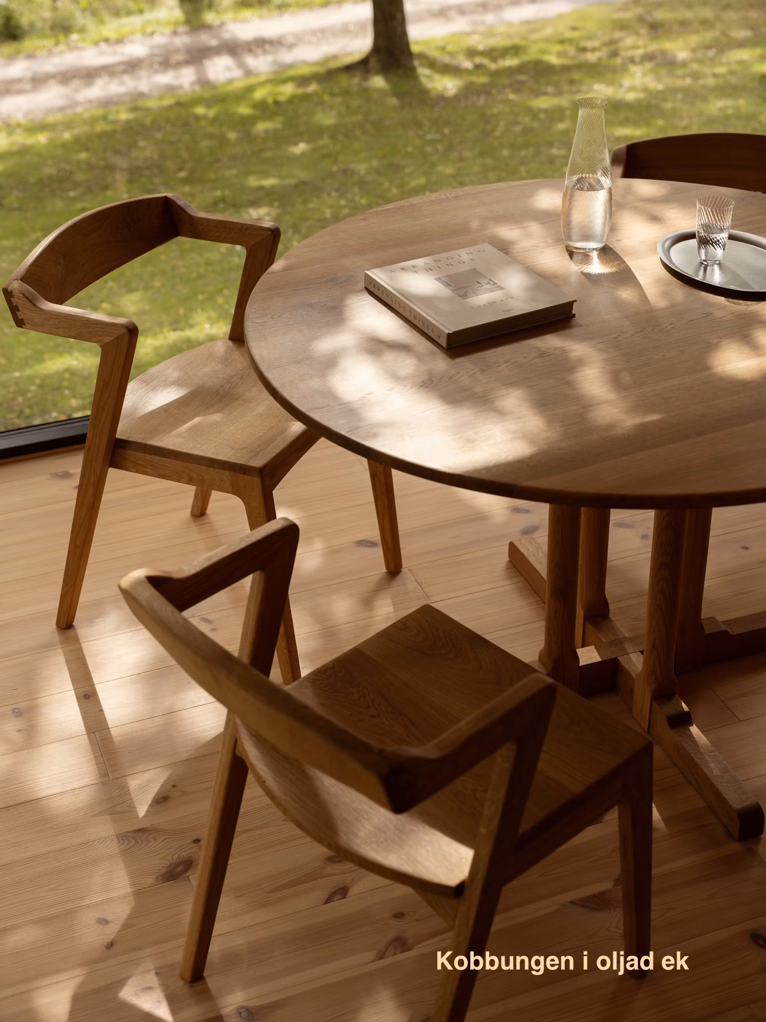 Detta matbord är en rund version av vårt bord Kobbungen. Vi är lite extra stolta över hur fint det blev med alla detaljer undertill, som också syns från sidan. Borden är massiva och stabila, men ändå eleganta och luftiga. Precis som de andra borden, är bordet döpt efter naturreservat som ligger i de landskap som ekarna har sitt ursprung ifrån.