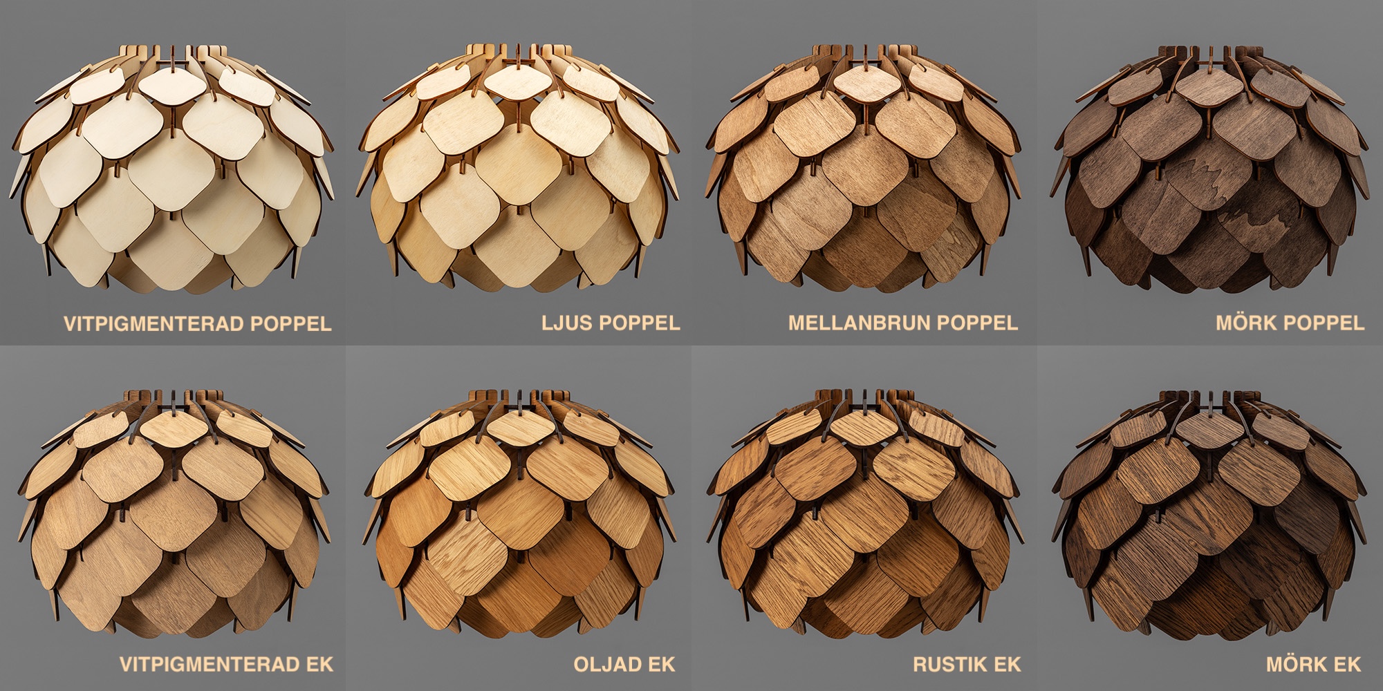 Lamporna är gjorda av ek eller poppel som betsas till olika nyanser